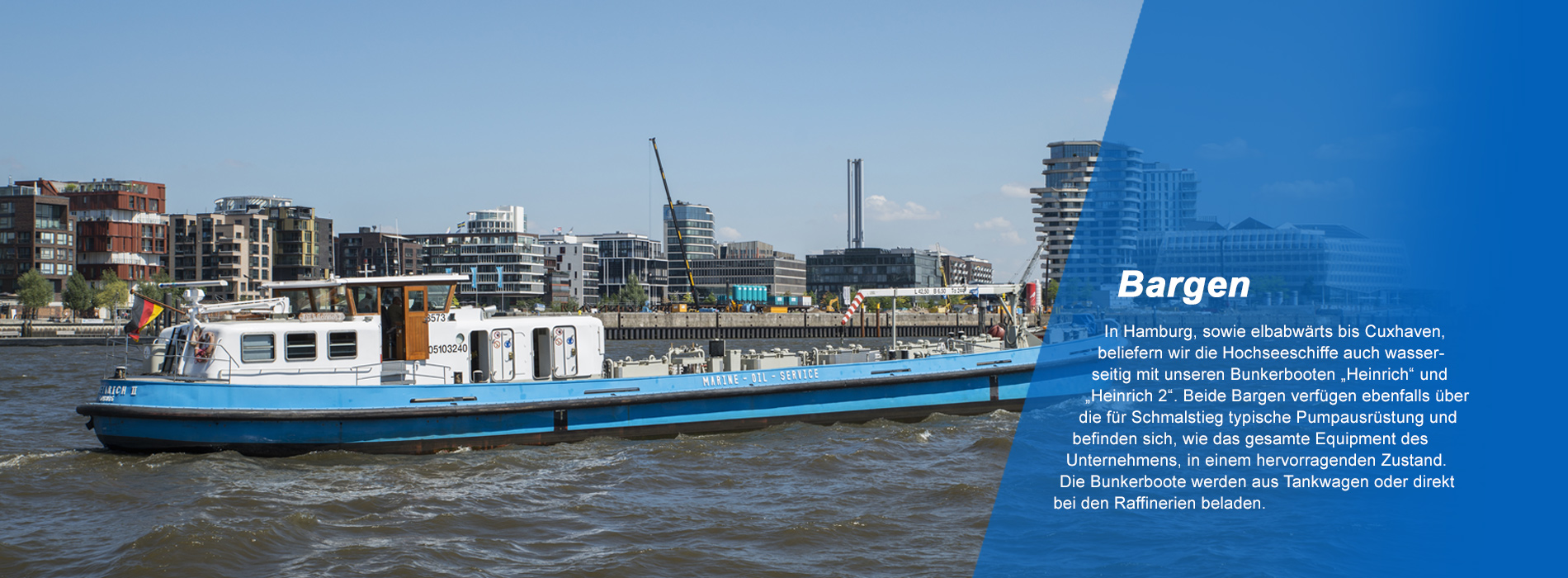 In Hamburg, sowie elbabwärts bis Cuxhaven, führen wir die Belieferungen der Hochseeschiffe auch mit unseren Bunkerbooten „Heinrich“ und „Heinrich 2“ wasserseitig durch. Beide Bargen sind mit modernen Navigationshilfen ausgestattet und befinden sich, wie das gesamte Equipment des Unternehmens, in einem hervorragenden Zustand. Die Bunkerboote werden aus Tankwagen oder direkt bei den Schmierstoffwerken beladen.
