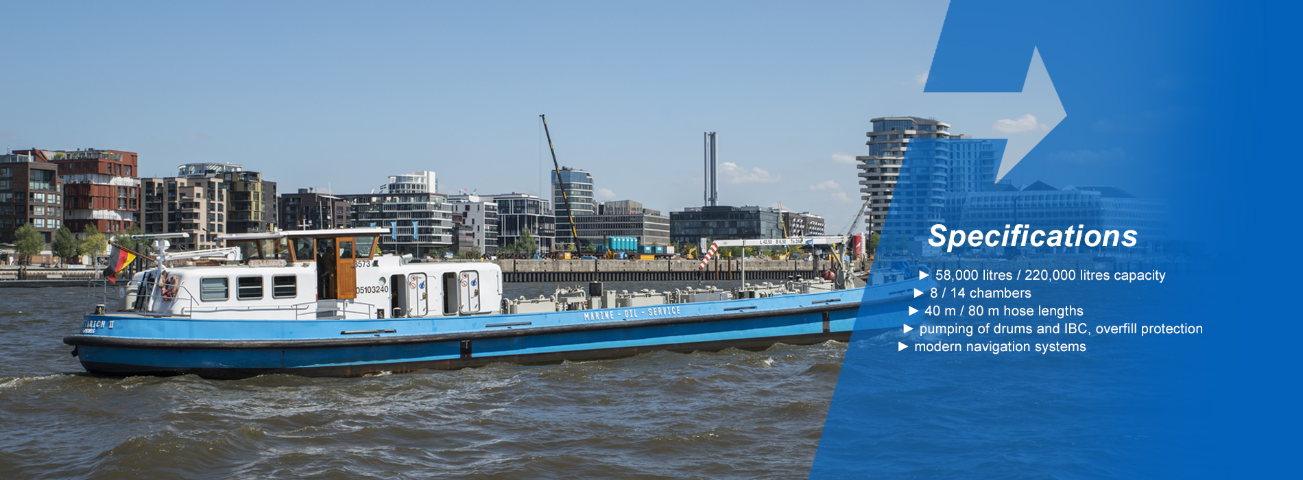 We also perform at-sea deliveries in Hamburg as well as further up the Elbe as far as Cuxhaven with our supply vessels ‘Heinrich’ and ‘Heinrich 2’. Both barges are fitted with modern navigation equipment and are in excellent condition, as is the company’s equipment as a whole. The supply vessels are loaded from tanker vehicles or directly from the lubricant plants.